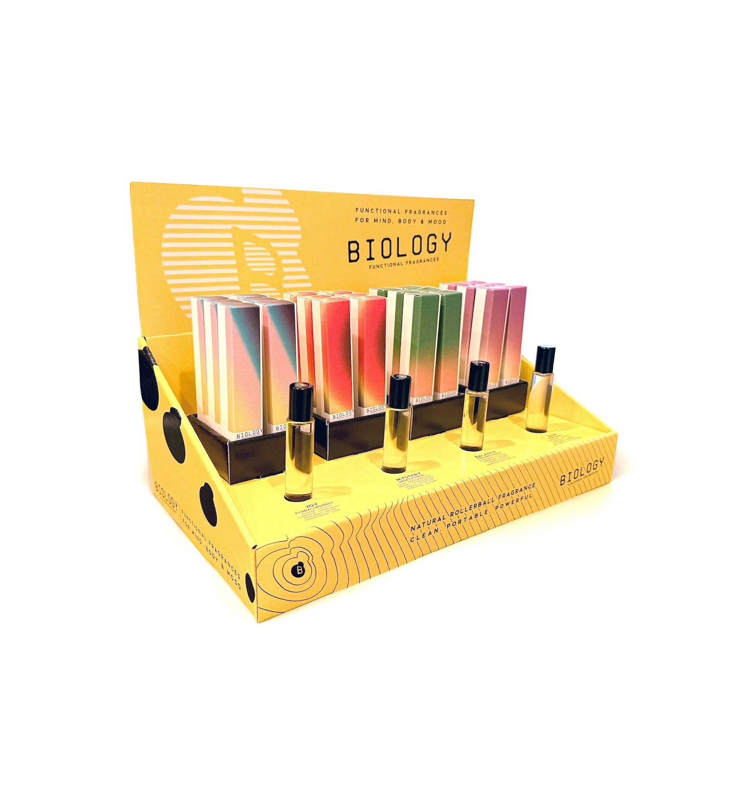 At Sprouts, Biology’s four bestselling $32 fragrance oil rollerballs—Joy, Deep, Mystery and Balance—will be housed in brightly colored product display quickly (PDQ) endcaps meant to grab consumers’ attention. Modern and splashed with yellow, the displays are designed to stand out in a sea of mostly muted colors and to feature descriptions of fragrance notes, functionality and intention. Testers of the four scents will be available.