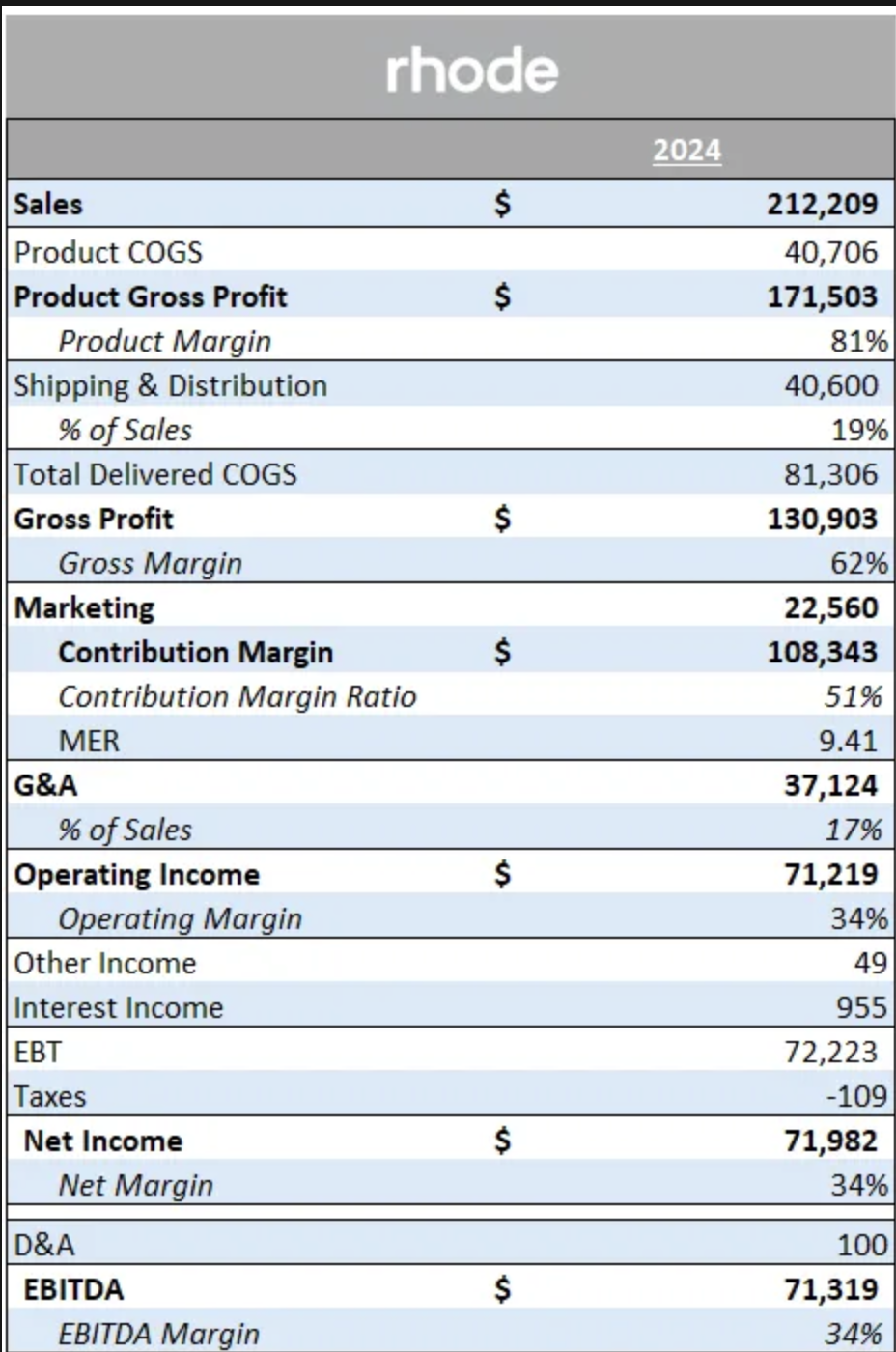 Here's what's actually interesting: Rhode's 81% gross margin is good, but not exceptional for beauty. The whole financial performance is just marketing efficiency cascading through the P&L. Take away the celebrity distribution advantage, and you have a pretty standard beauty brand with bloated overhead.